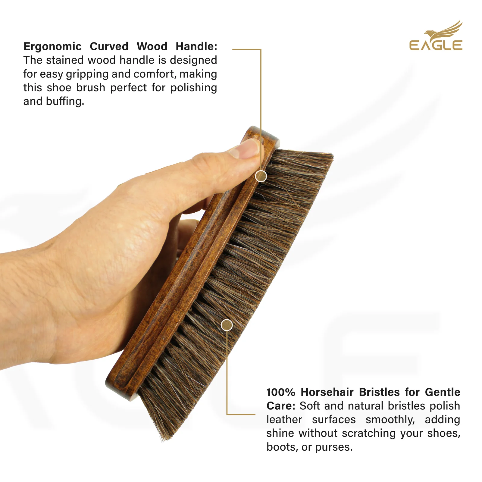 Ergonomic Curved Wood Handle – Crafted from stained wood, the curved handle provides a comfortable grip, ensuring precise control during shoe care routines.