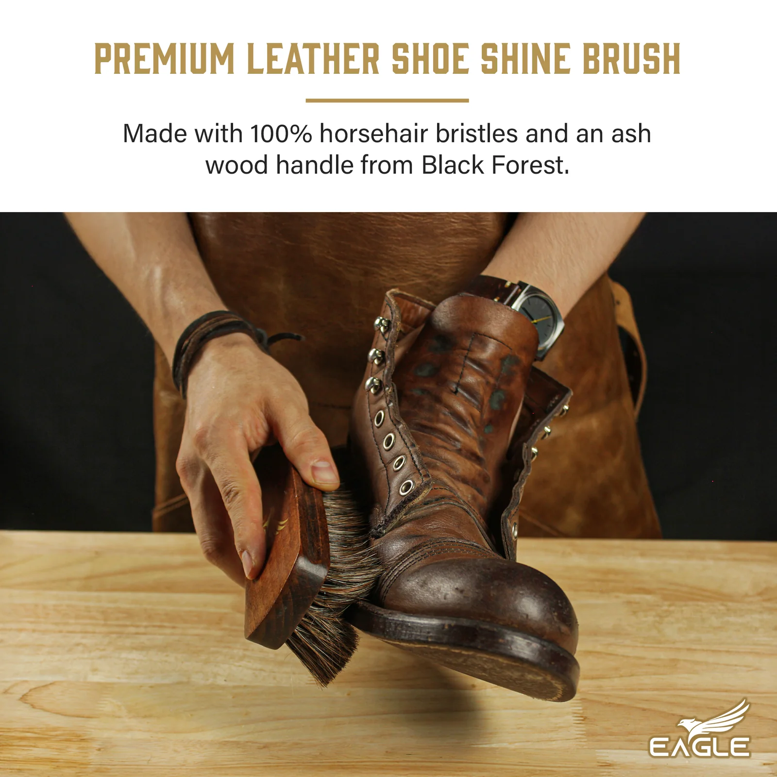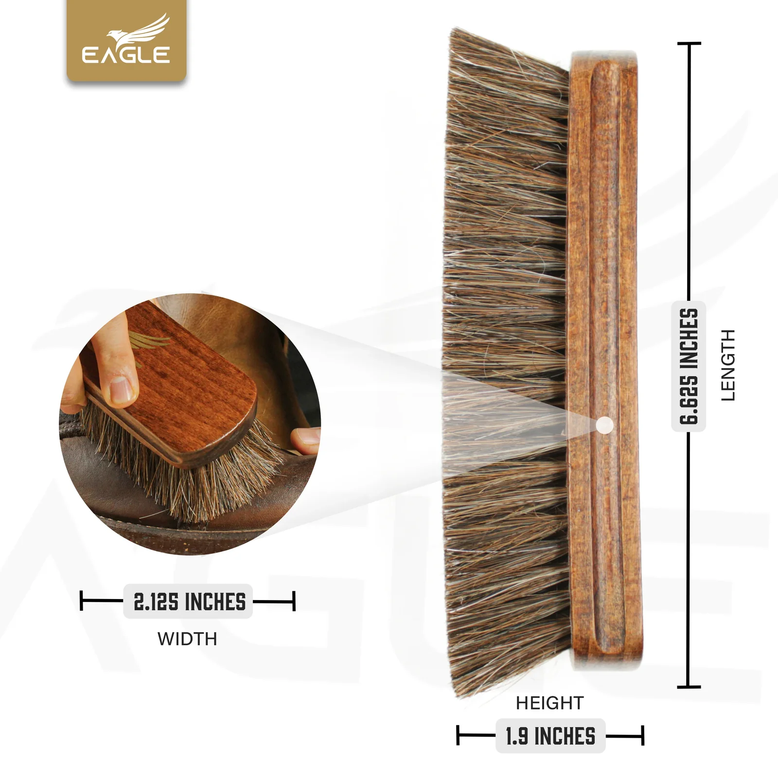 100% Premium Horsehair Bristles – Soft yet firm bristles effectively distribute polish and buff leather surfaces to a brilliant shine without scratching or damaging.