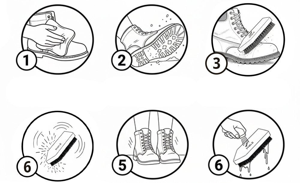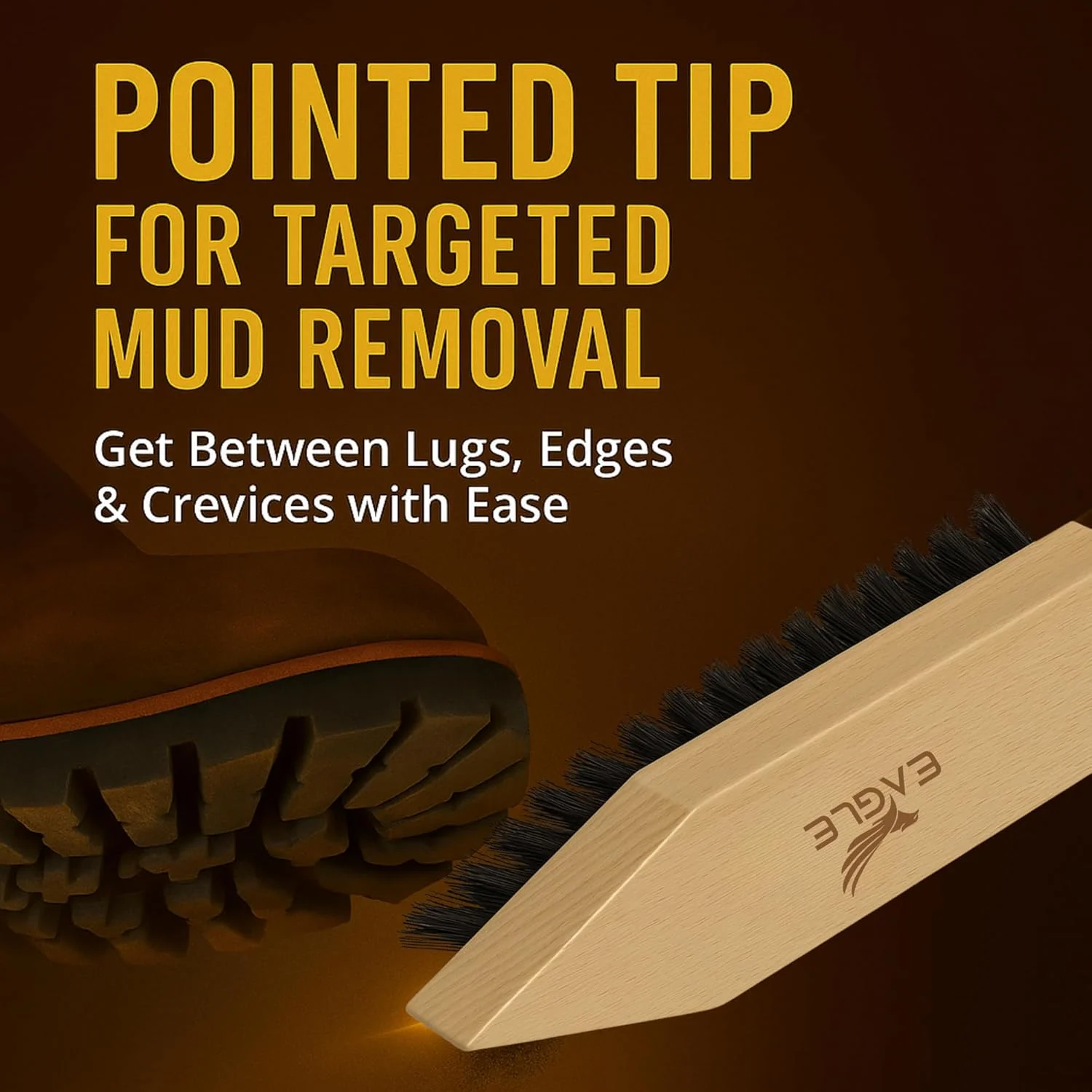 Eagle Boot & Cleat Brush is best for cleaning soles, treads, and outsoles. The stiff bristles are too strong for delicate uppers or leather surfaces.