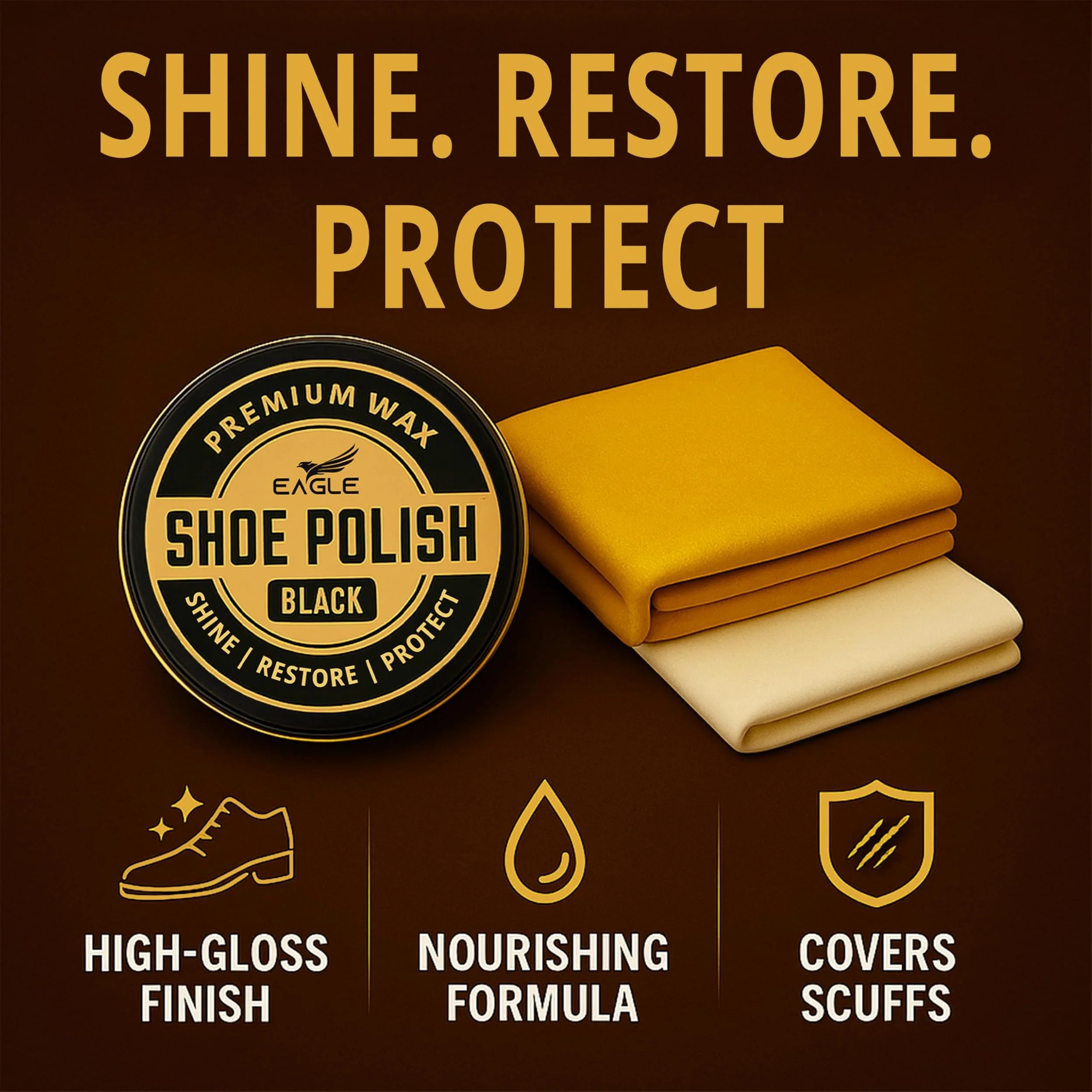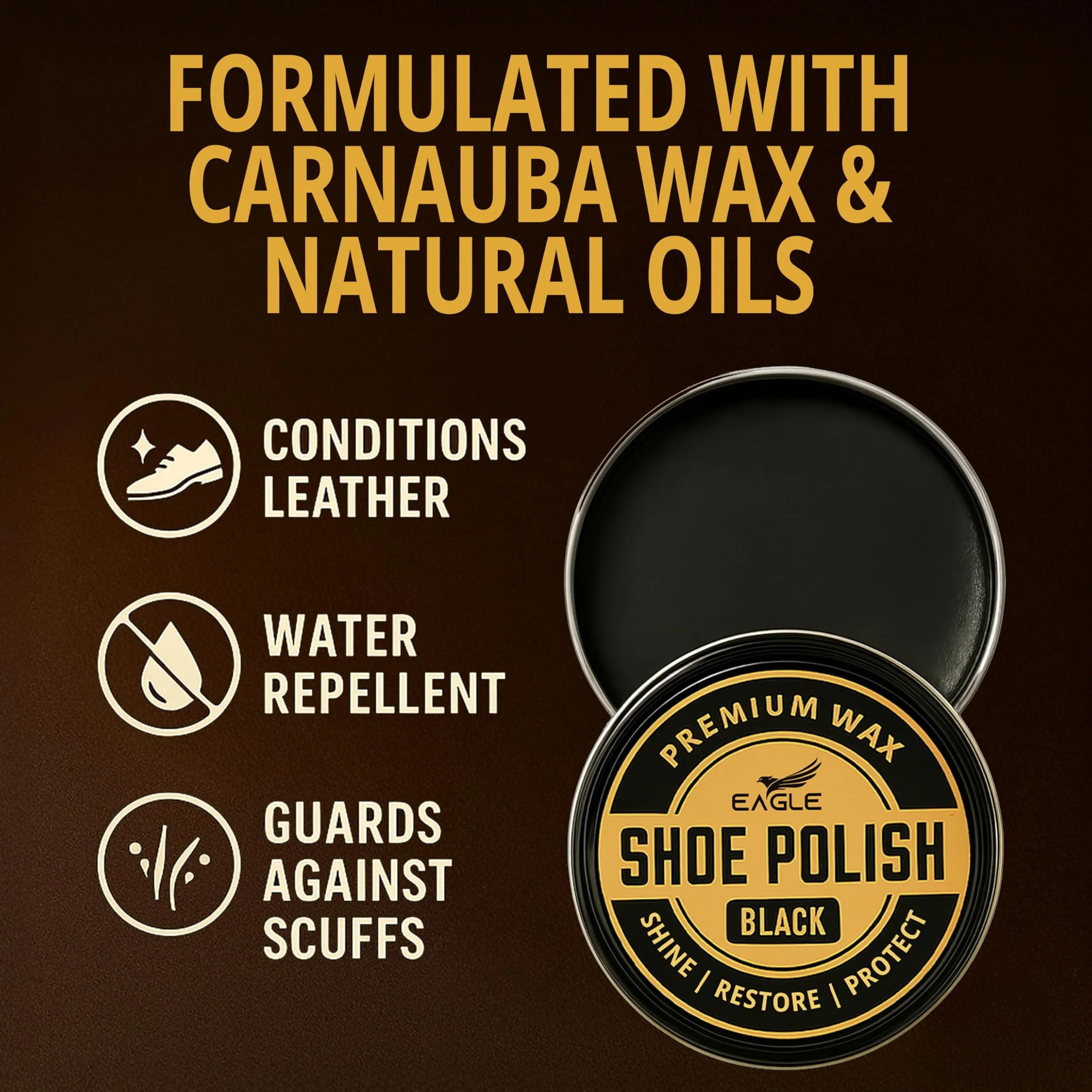 Eagle Shoe Polish Wax features a premium wax formula that restores color, covers scuffs, and nourishes leather while delivering a high-gloss, mirror-like shine. It refreshes worn or faded shoes, boots, belts, and other leather accessories.