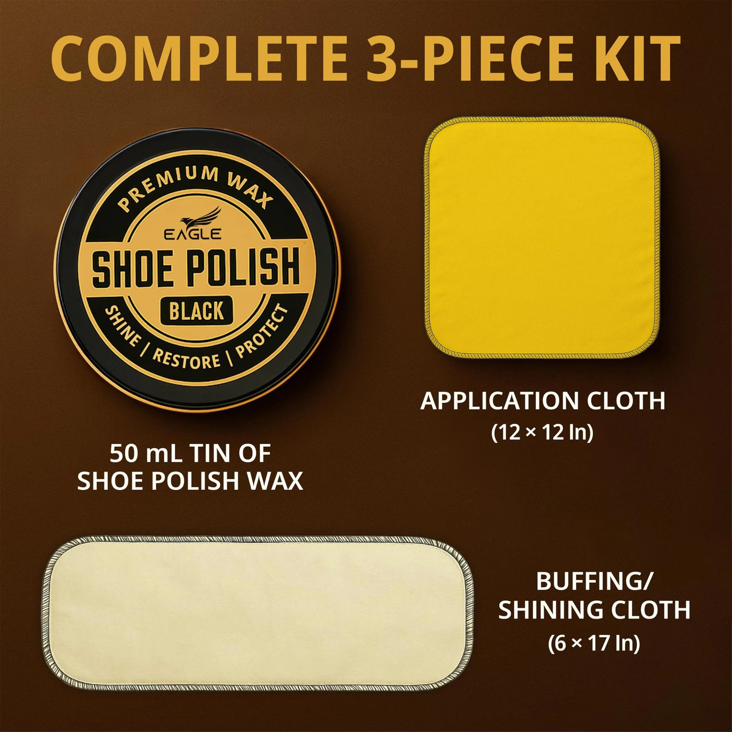 ● Includes 50 mL black shoe polish, soft application cloth, & buffing cloth