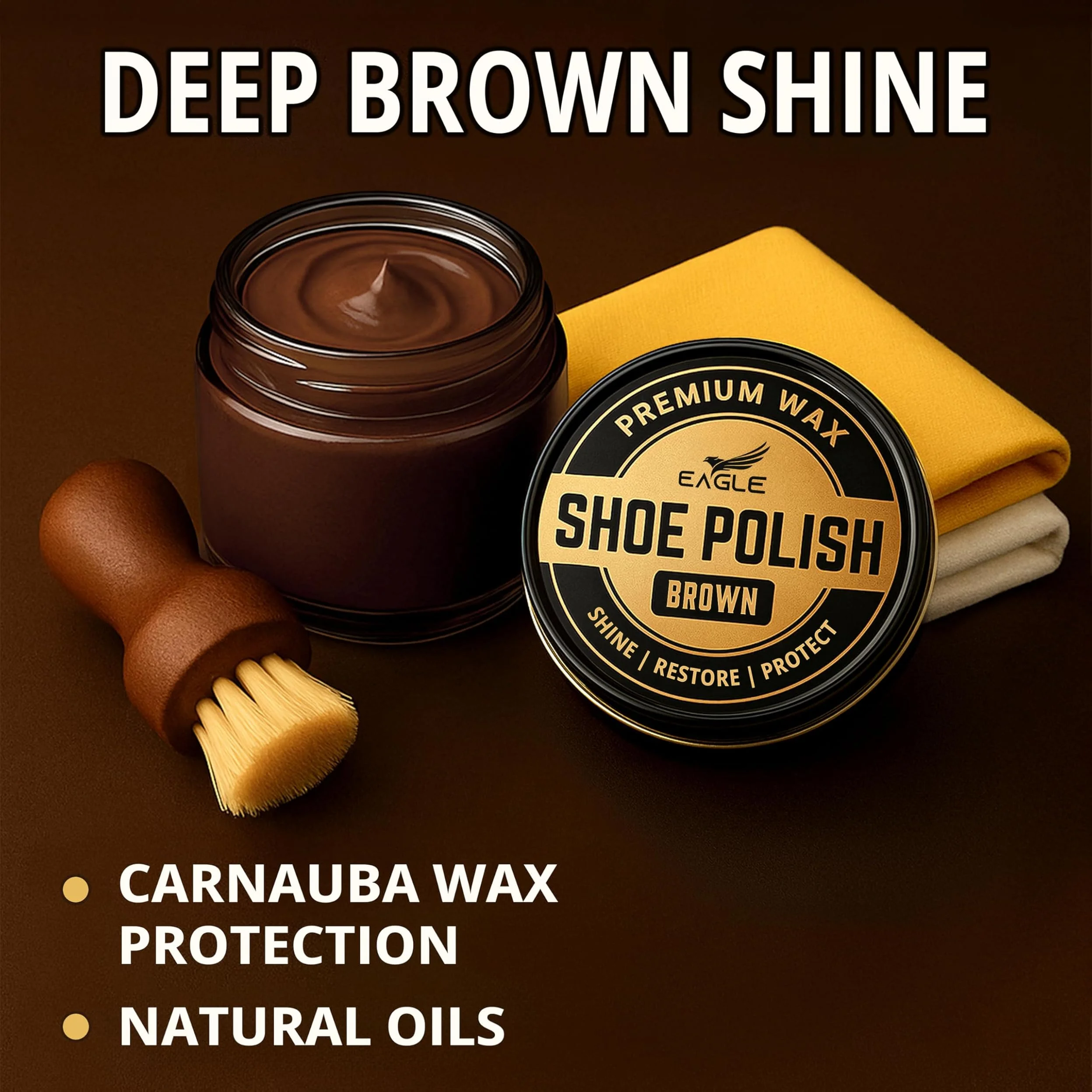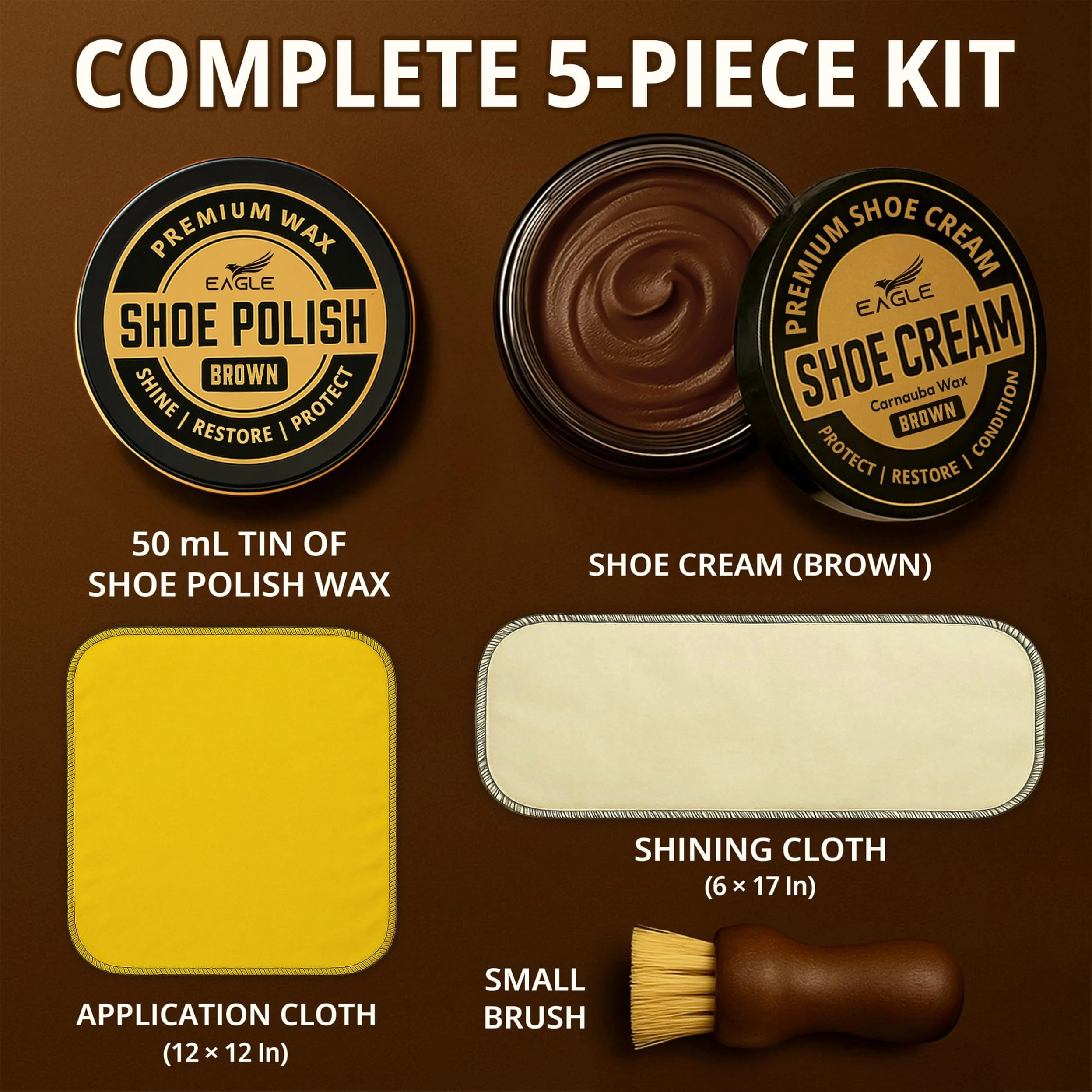 ● Includes brown shoe polish, brown shoe cream, wooden dauber, yellow wax cloth & cotton shine cloth.