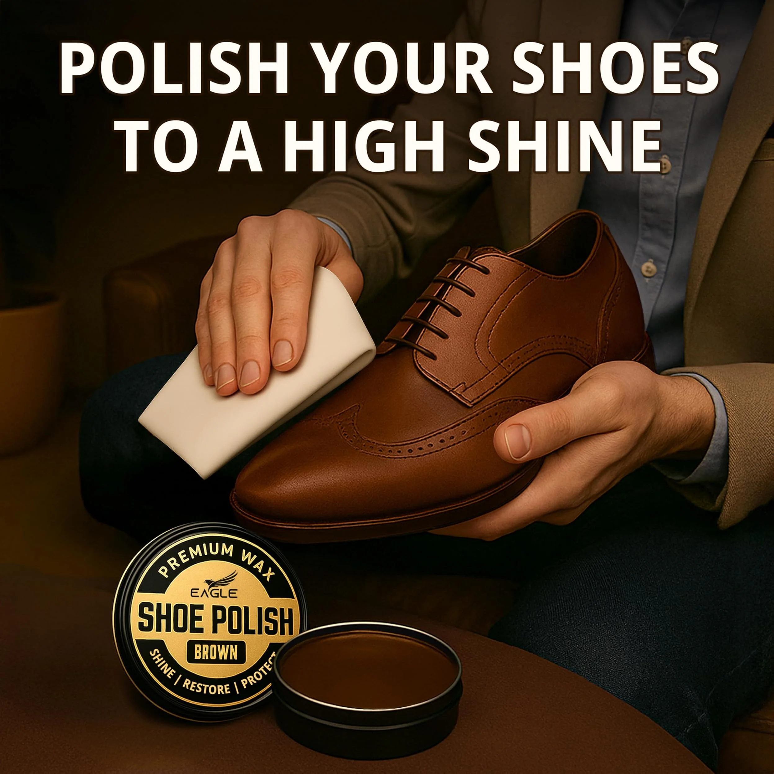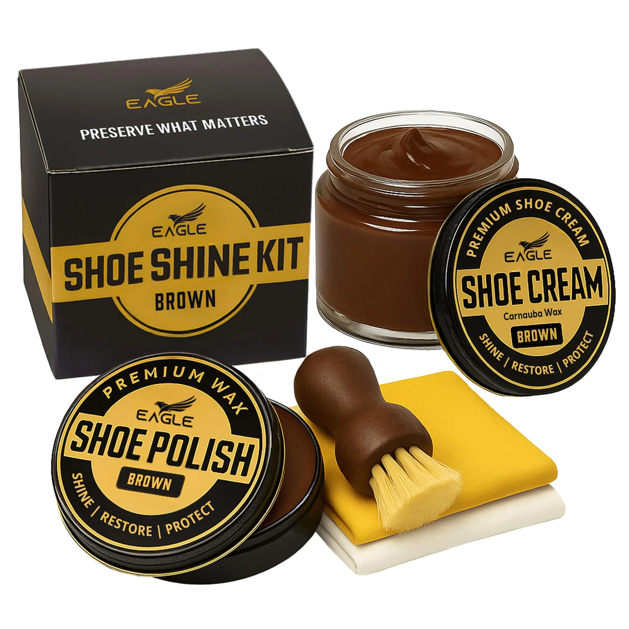 Eagle 5-Piece Shoe Shine Kit is designed to restore color, enhance shine, and protect leather shoes and boots using a premium polish and cream care formula. Made with beeswax and carnauba wax, it helps improves durability, nourish leather, and delivers a rich, long-lasting gloss while helping repel water and everyday wear.