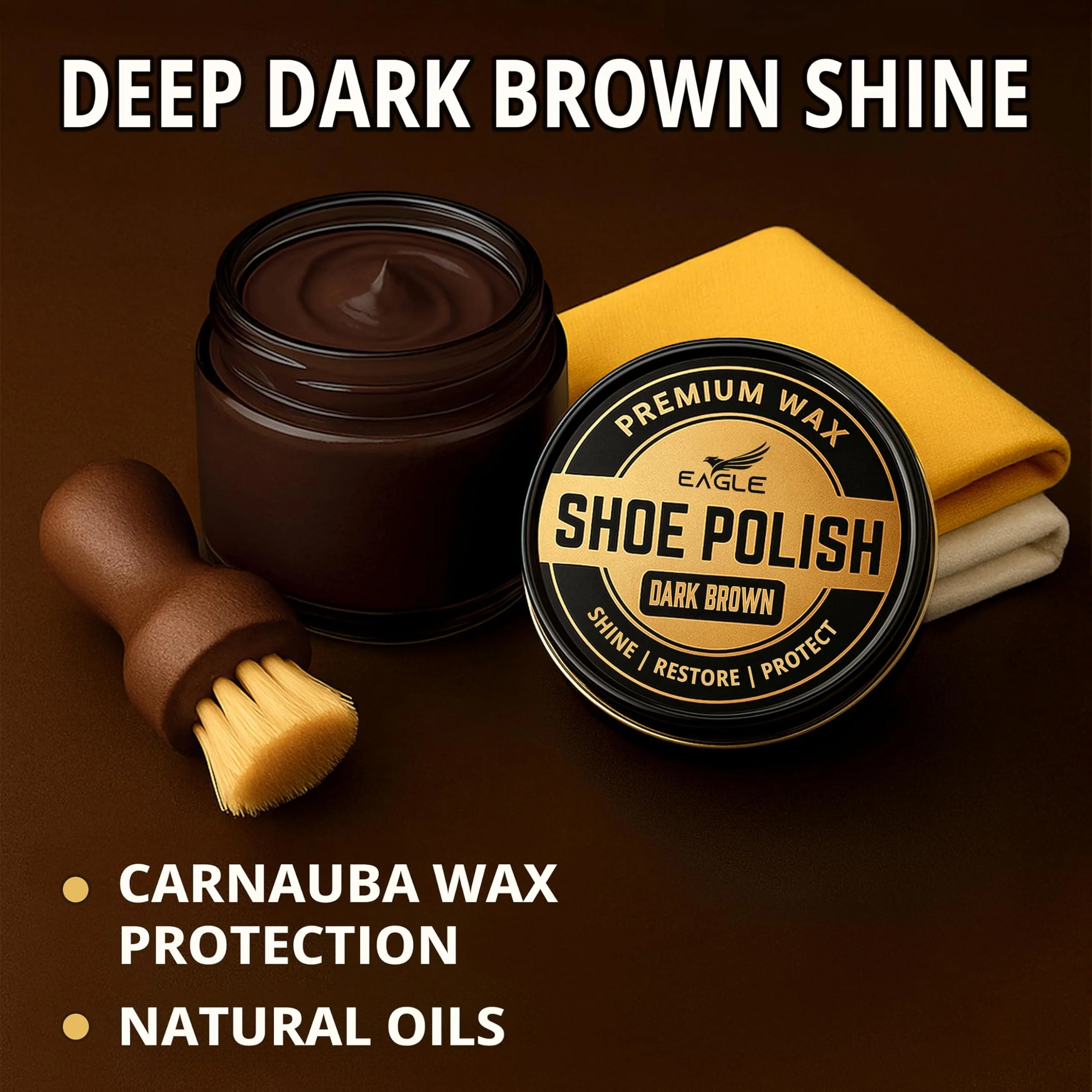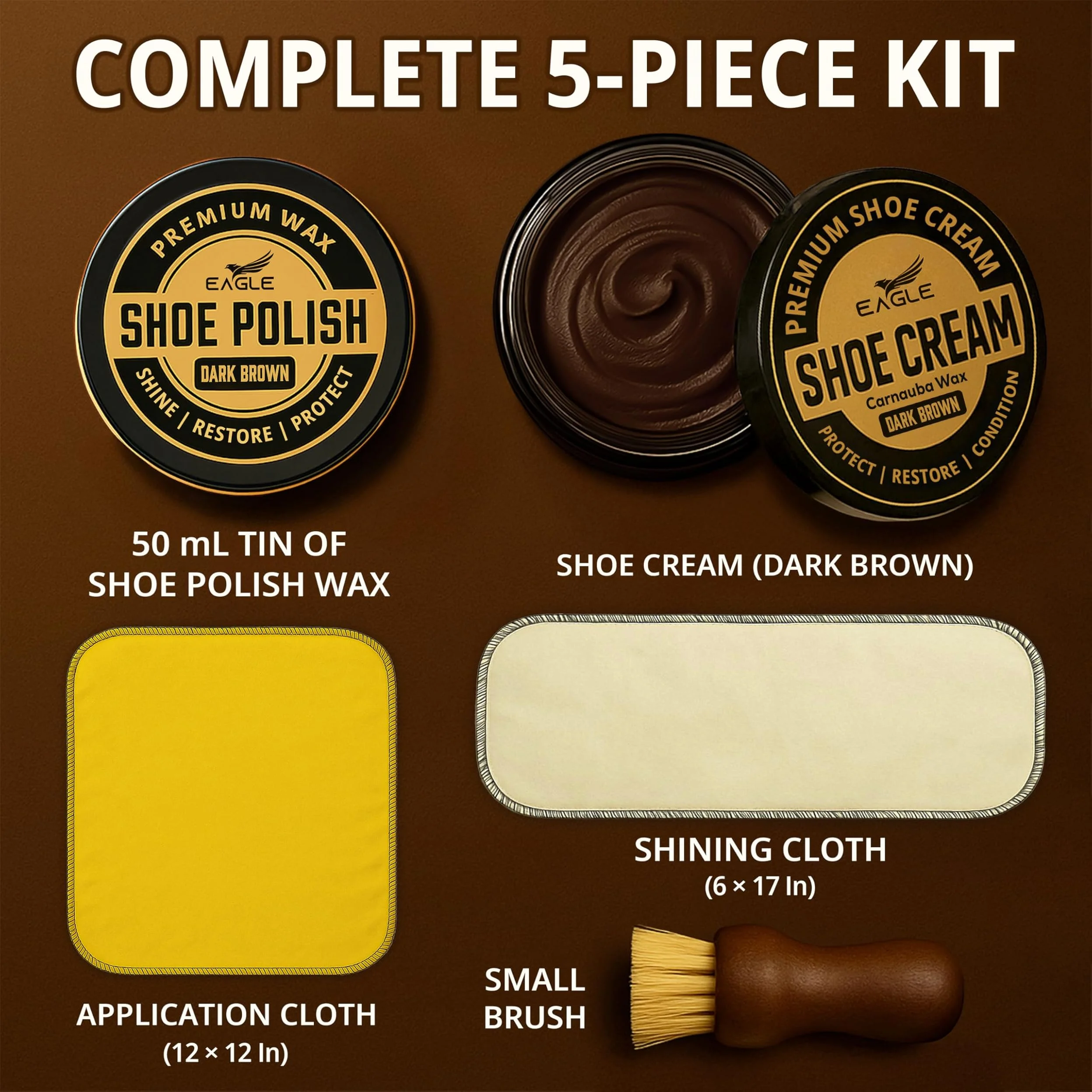 ● Includes dark brown shoe polish, dark brown shoe cream, wooden dauber, yellow wax cloth & cotton shine cloth.