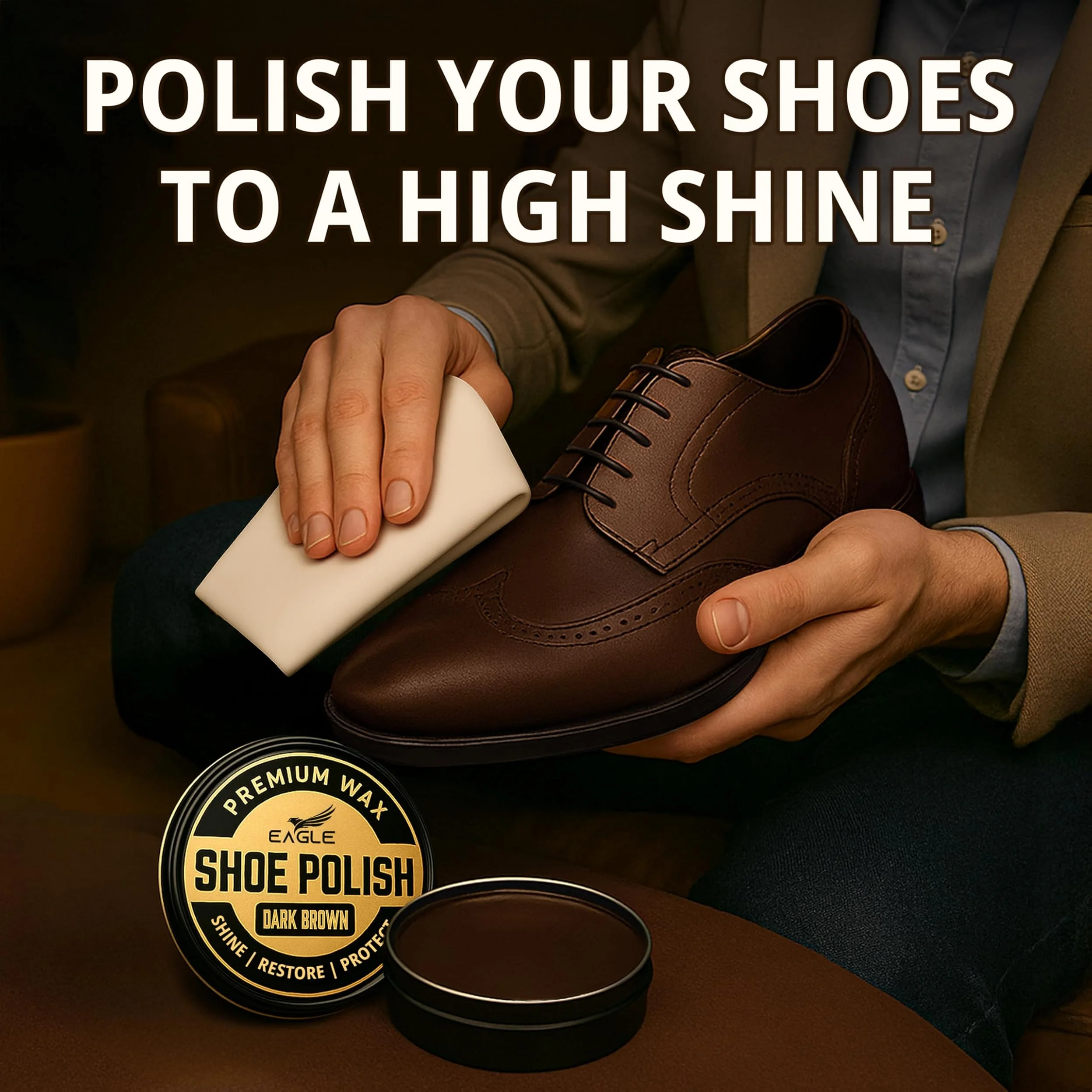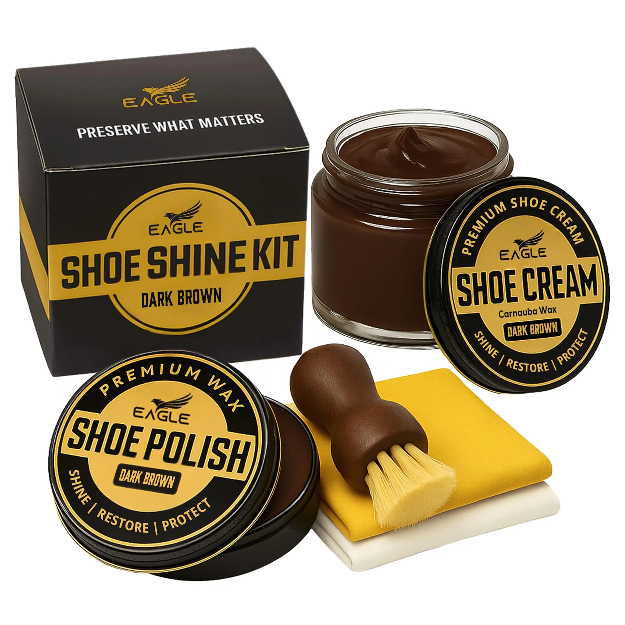 Eagle 5-Piece Shoe Shine Kit is designed to restore color, enhance shine, and protect leather shoes and boots using a premium polish and cream care formula. Made with beeswax and carnauba wax, it helps improves durability, nourish leather, and delivers a rich, long-lasting gloss while helping repel water and everyday wear.
