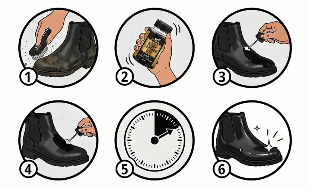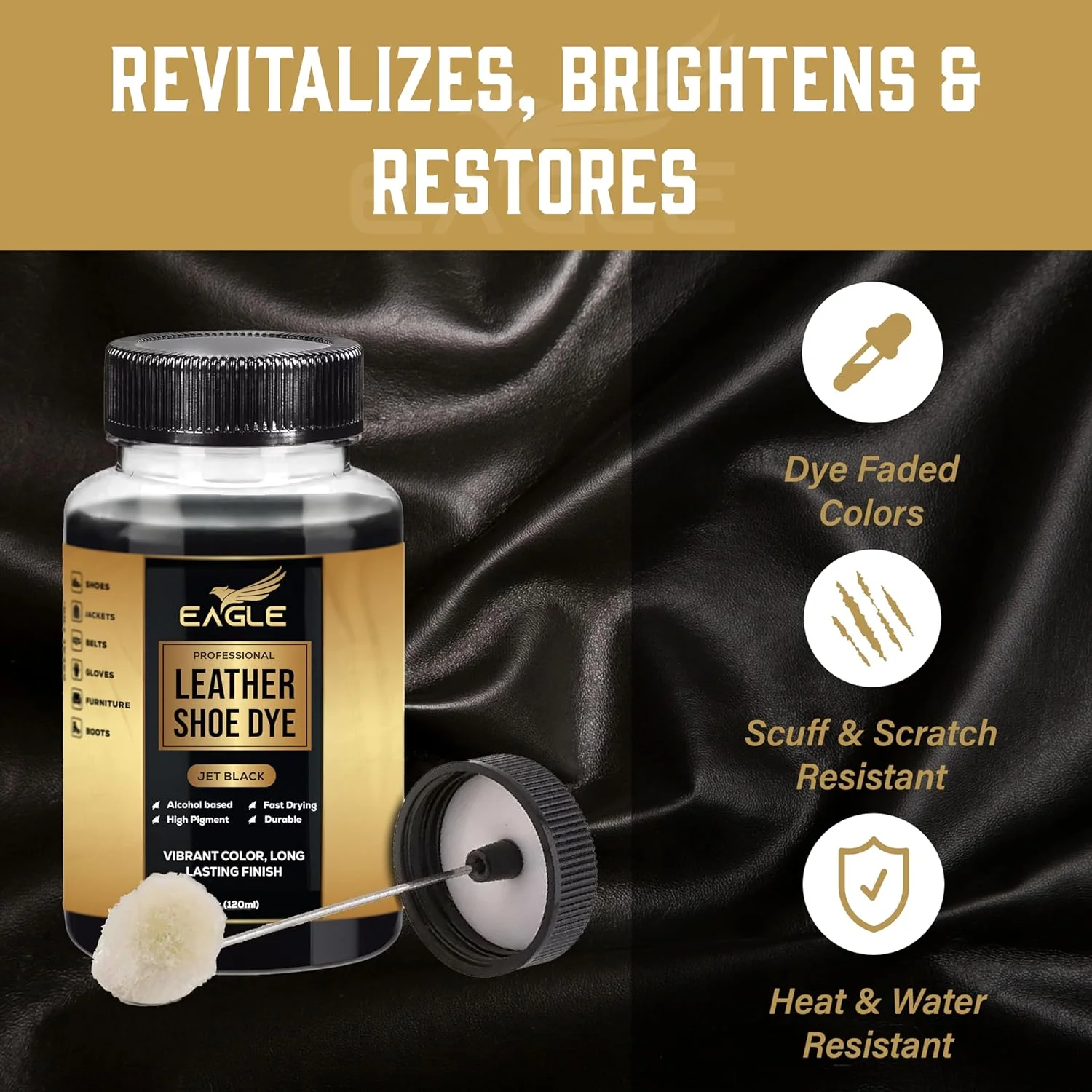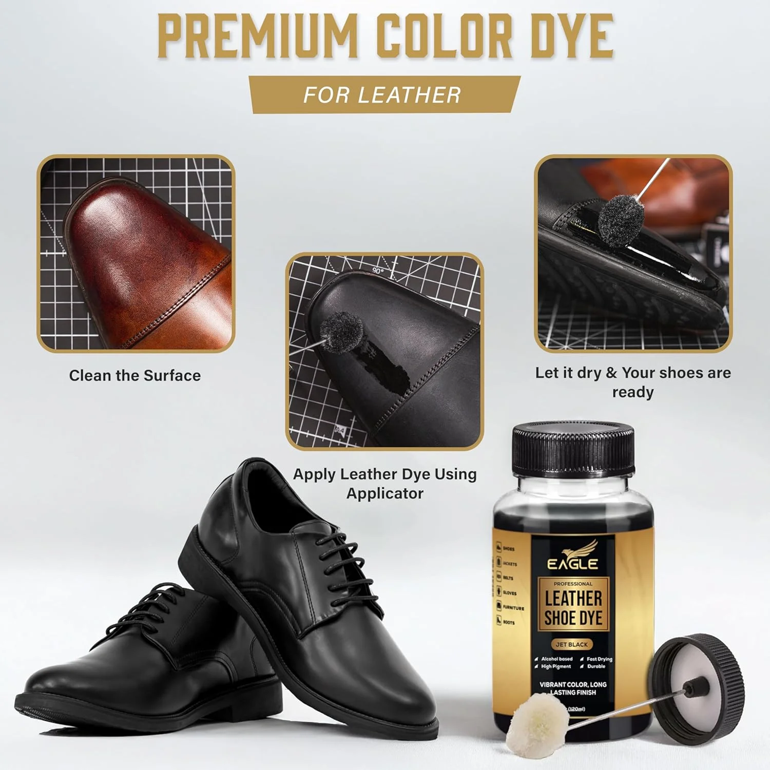 Deep-penetrating jet black leather dye that restores, recolors, and enhances all types of leather. Perfect for leather shoes, boots, bags, and furniture, it revitalizes worn or faded areas while maintaining a soft, flexible, and natural leather texture for a professional, long-lasting finish.
