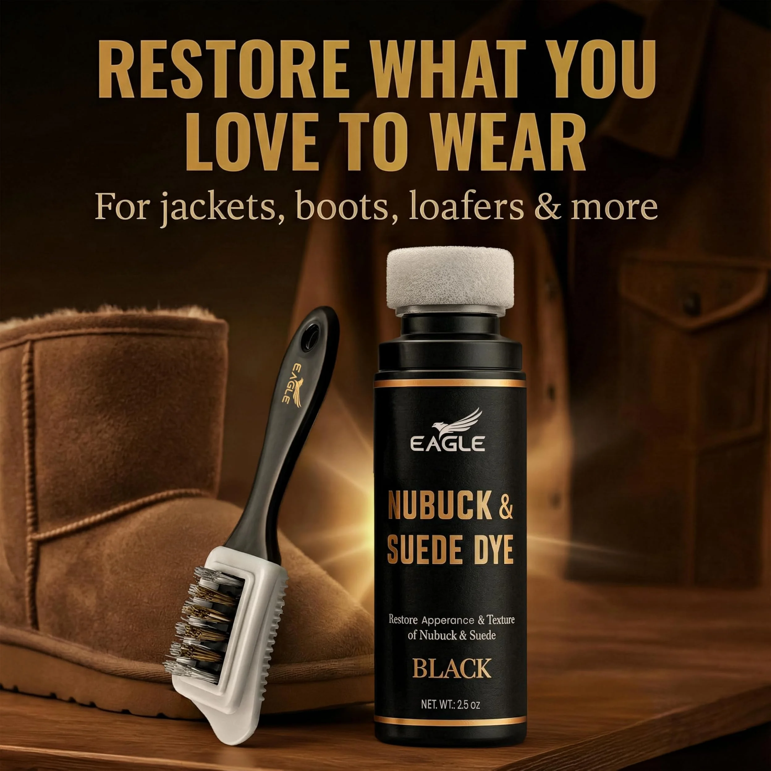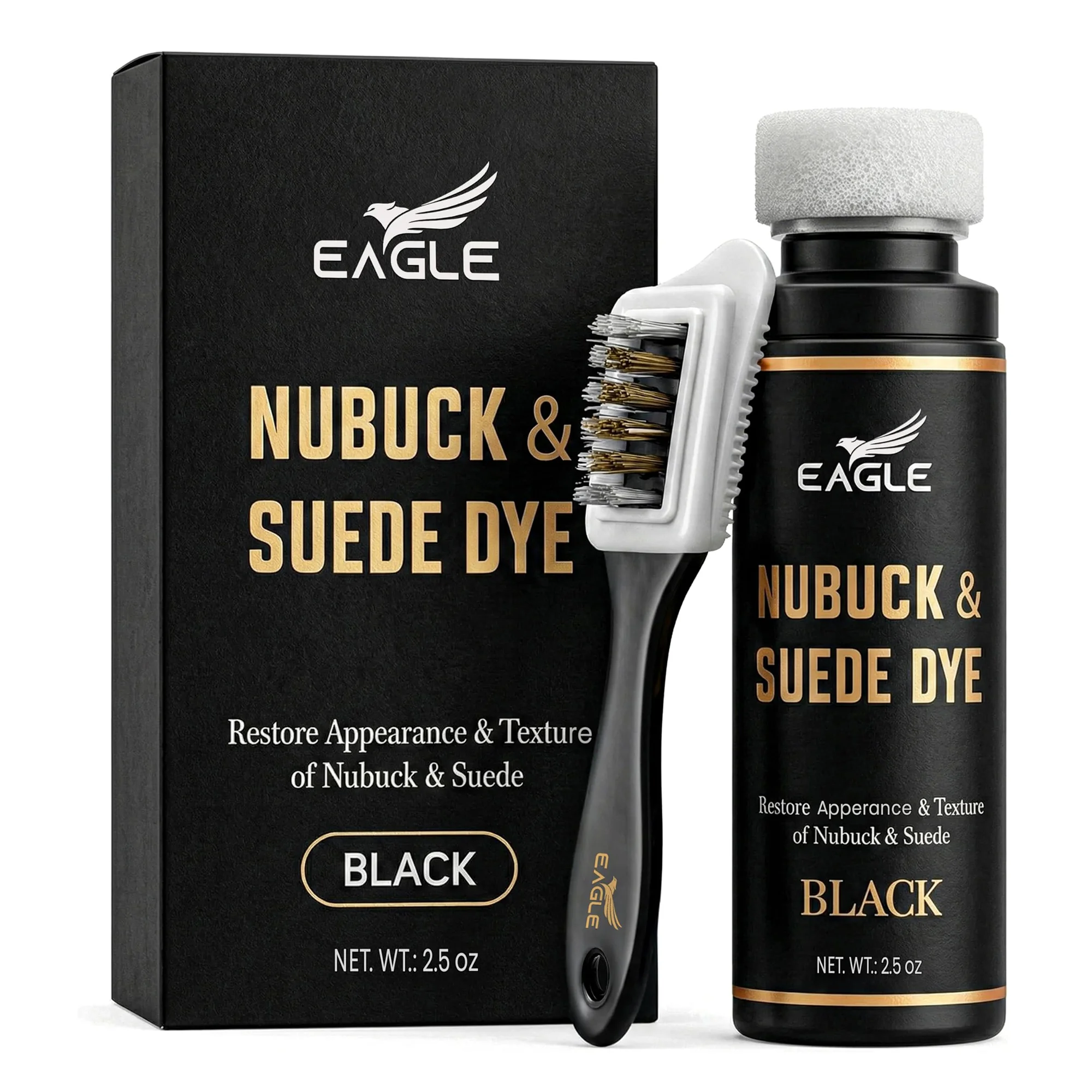 Eagle Nubuck & Suede Dye Black features a rich, professional-grade formula that restores faded or discolored suede and nubuck while maintaining its soft texture. It recolors, conditions, and protects shoes, boots, jackets, purses, and other accessories for long-lasting results.