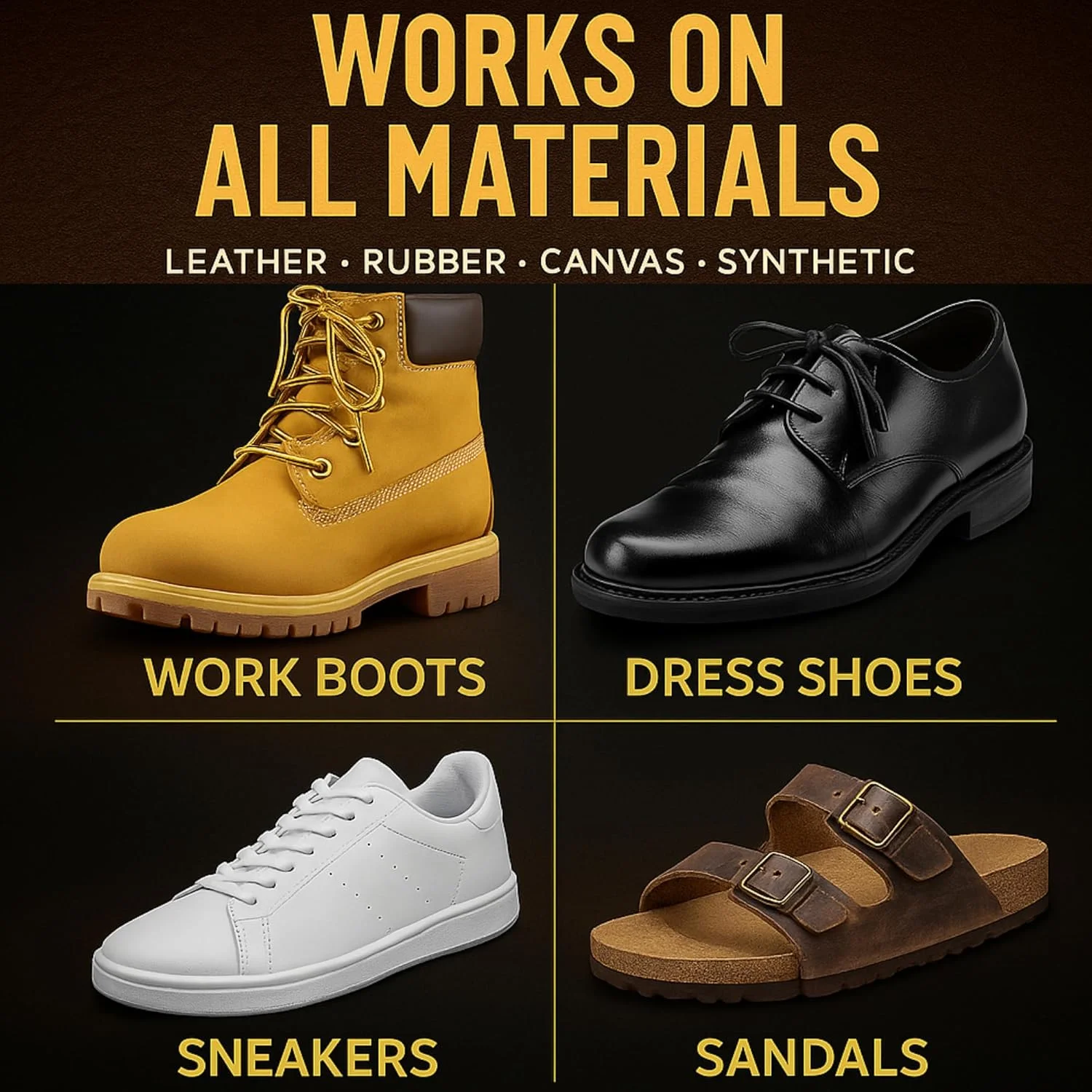 Yes. Eagle Shoe Cement works on sneakers, boots, dress shoes, sandals, and most shoe materials, including leather, rubber, vinyl, and synthetic uppers.