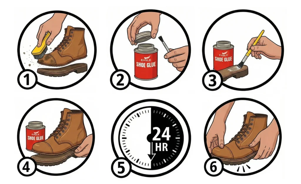 Eagle Shoe Cement features a heavy-duty, waterproof formula that bonds detached soles, separated midsoles, and torn uppers on sneakers, boots, and dress shoes. It provides strong, flexible adhesion for long-lasting, reliable shoe repairs.