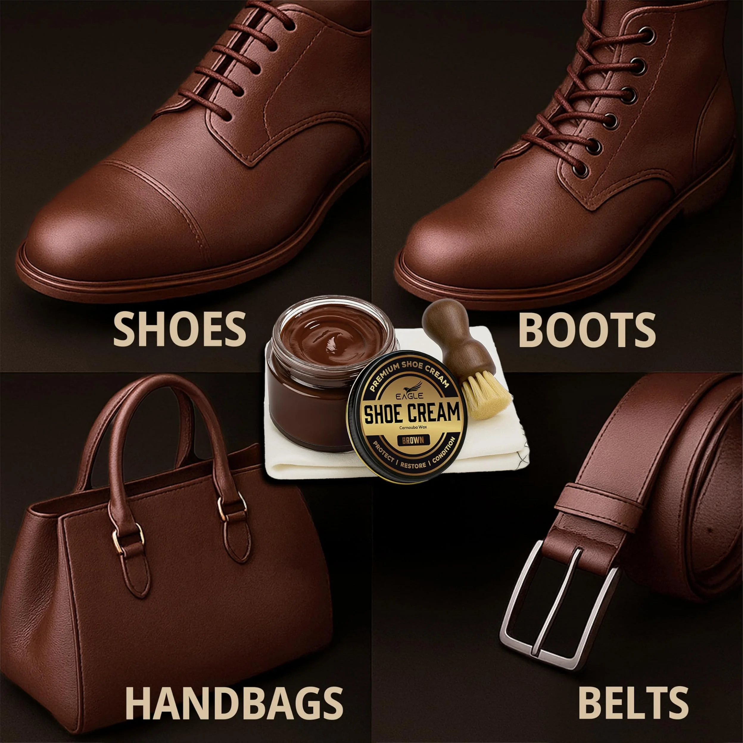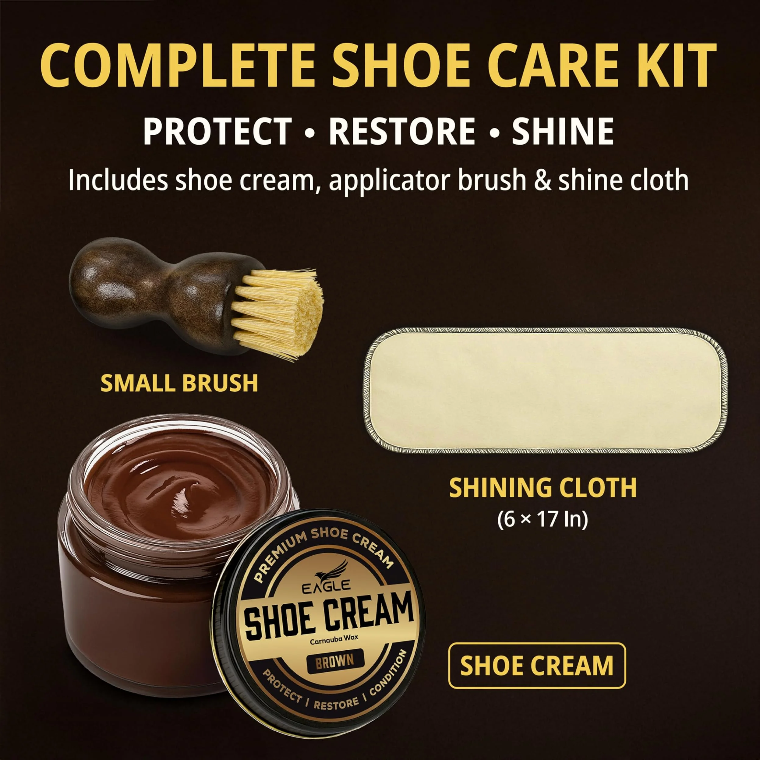 Eagle Shoe Cream Polish Kit features a premium carnauba-based formula that cleans, conditions, and polishes leather shoes and boots while restoring rich color and shine. It helps remove dirt, scuffs, and dullness while nourishing leather to keep dress shoes, loafers, oxfords, and boots looking their best.
