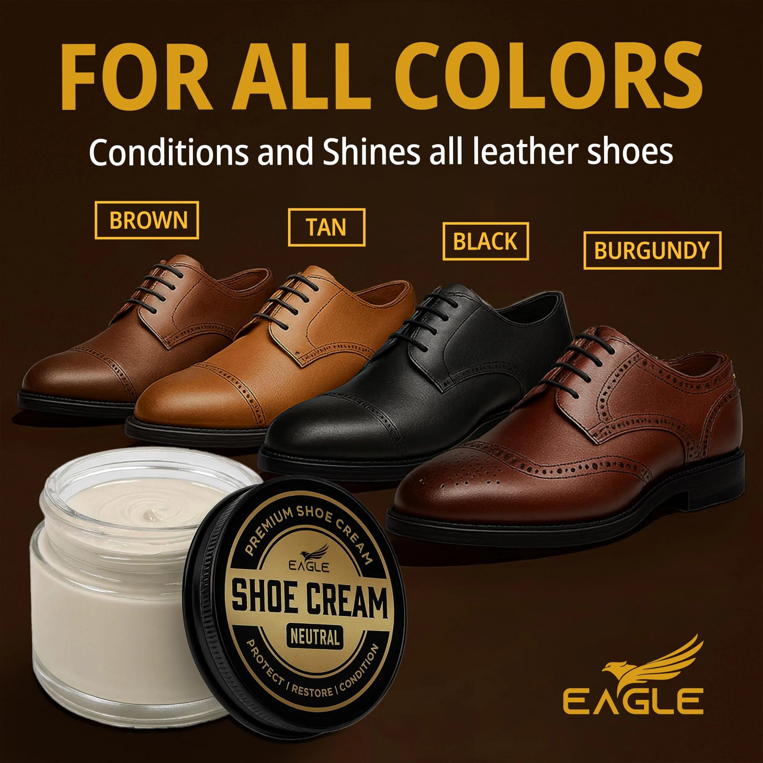 Eagle Shoe Cream Polish Kit features a premium carnauba-based formula that cleans, conditions, and polishes leather shoes and boots while restoring rich color and shine. It helps remove dirt, scuffs, and dullness while nourishing leather to keep dress shoes, loafers, oxfords, and boots looking their best.