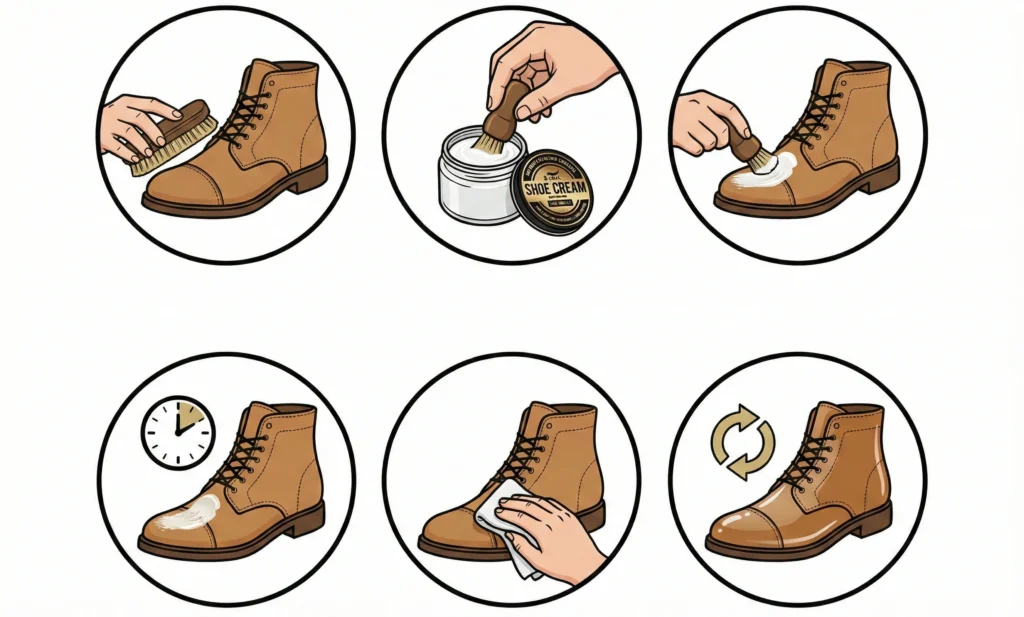 Apply a small amount of shoe cream—less is more for an even, high-gloss finish.