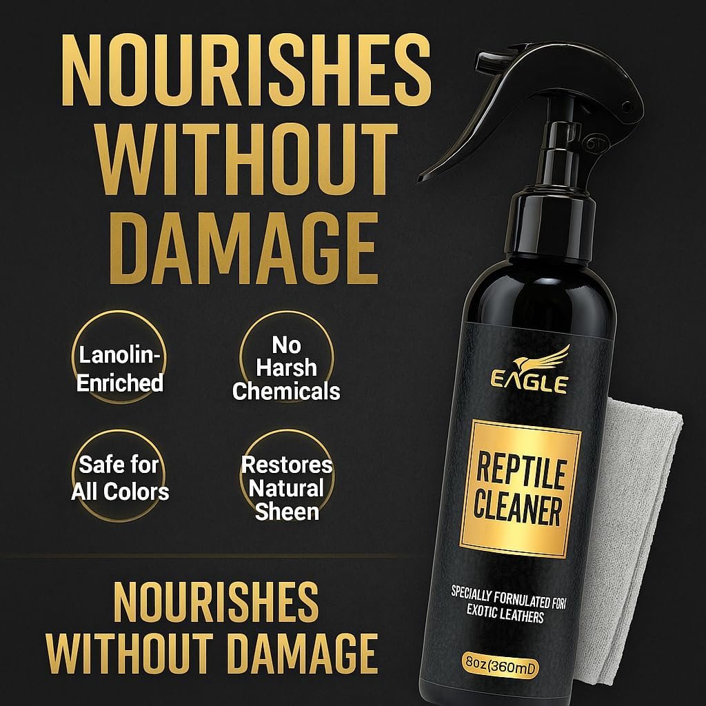 Eagle Exotic Leather Cleaner & Conditioner Spray features a lanolin-enriched formula that cleans, nourishes, and restores exotic leather while maintaining its natural texture and shine. It removes dirt, buildup, and oils to keep your alligator, crocodile, snakeskin, lizard, ostrich, and other exotic leather items in top condition.