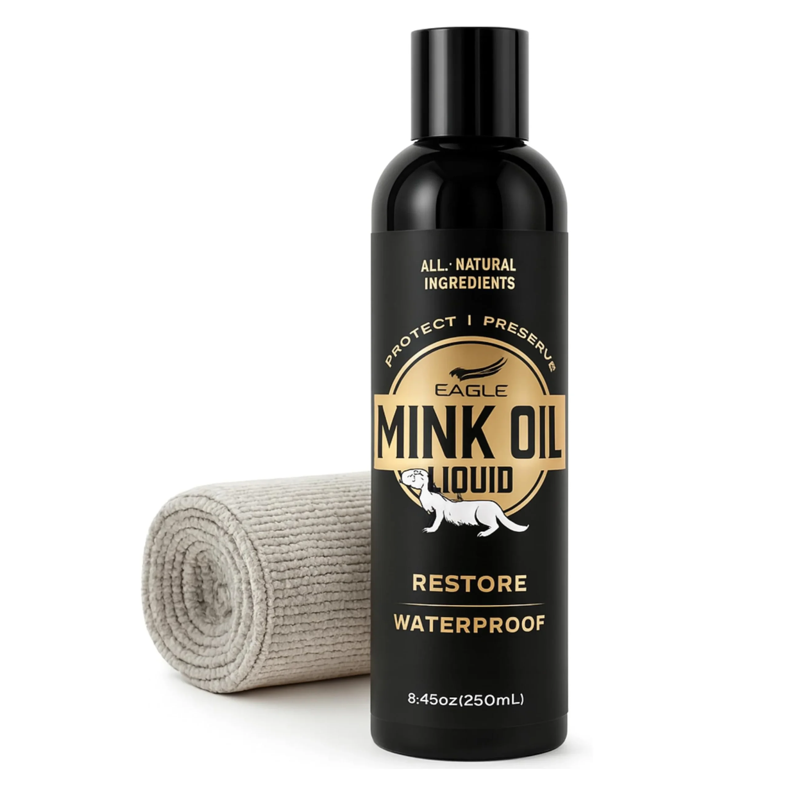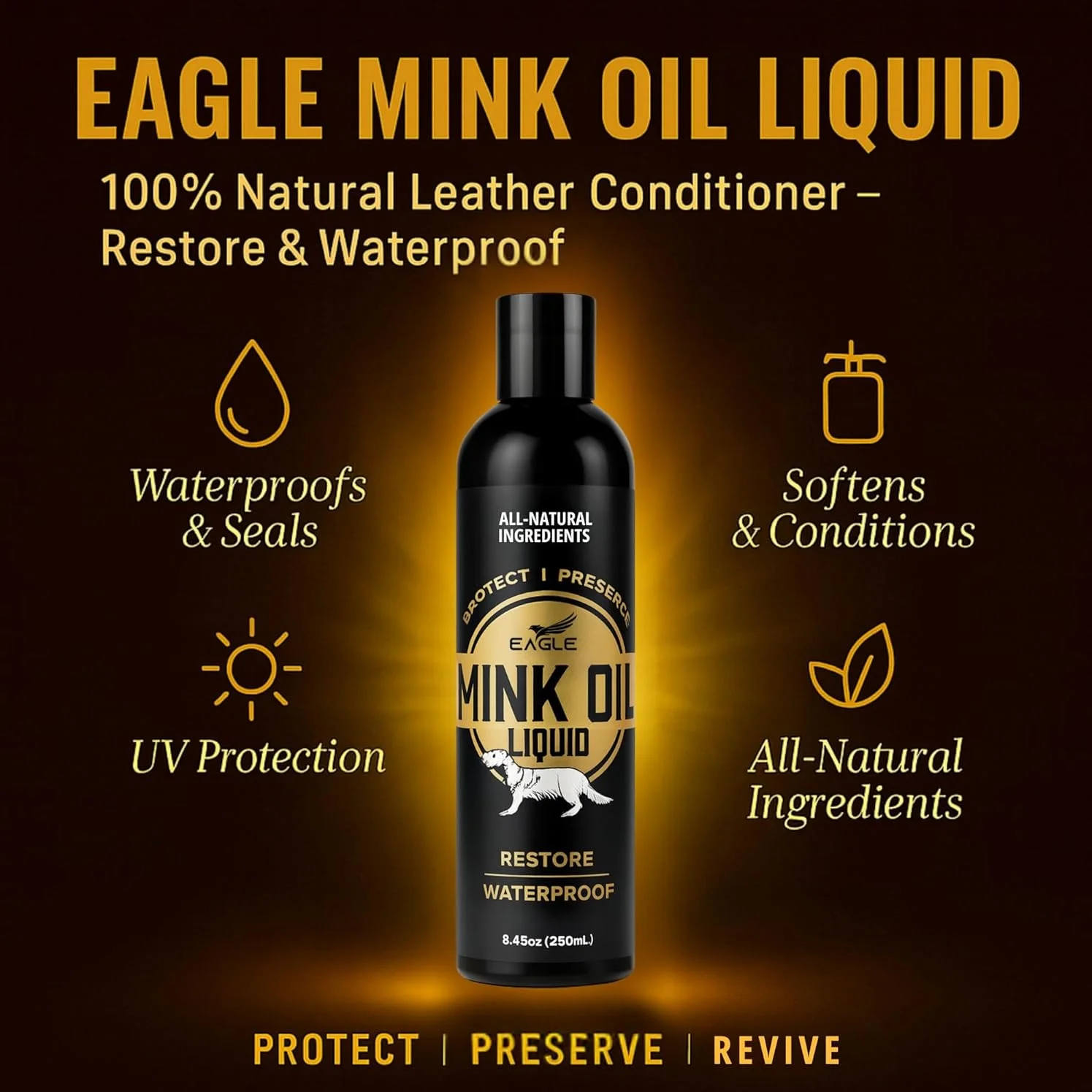 Eagle Mink Oil Liquid Leather Conditioner features a 100% pure mink oil formula that deeply nourishes, softens, and protects leather. It restores flexibility to dry or worn surfaces while creating a lasting waterproof barrier that repels moisture, salt, and stains.